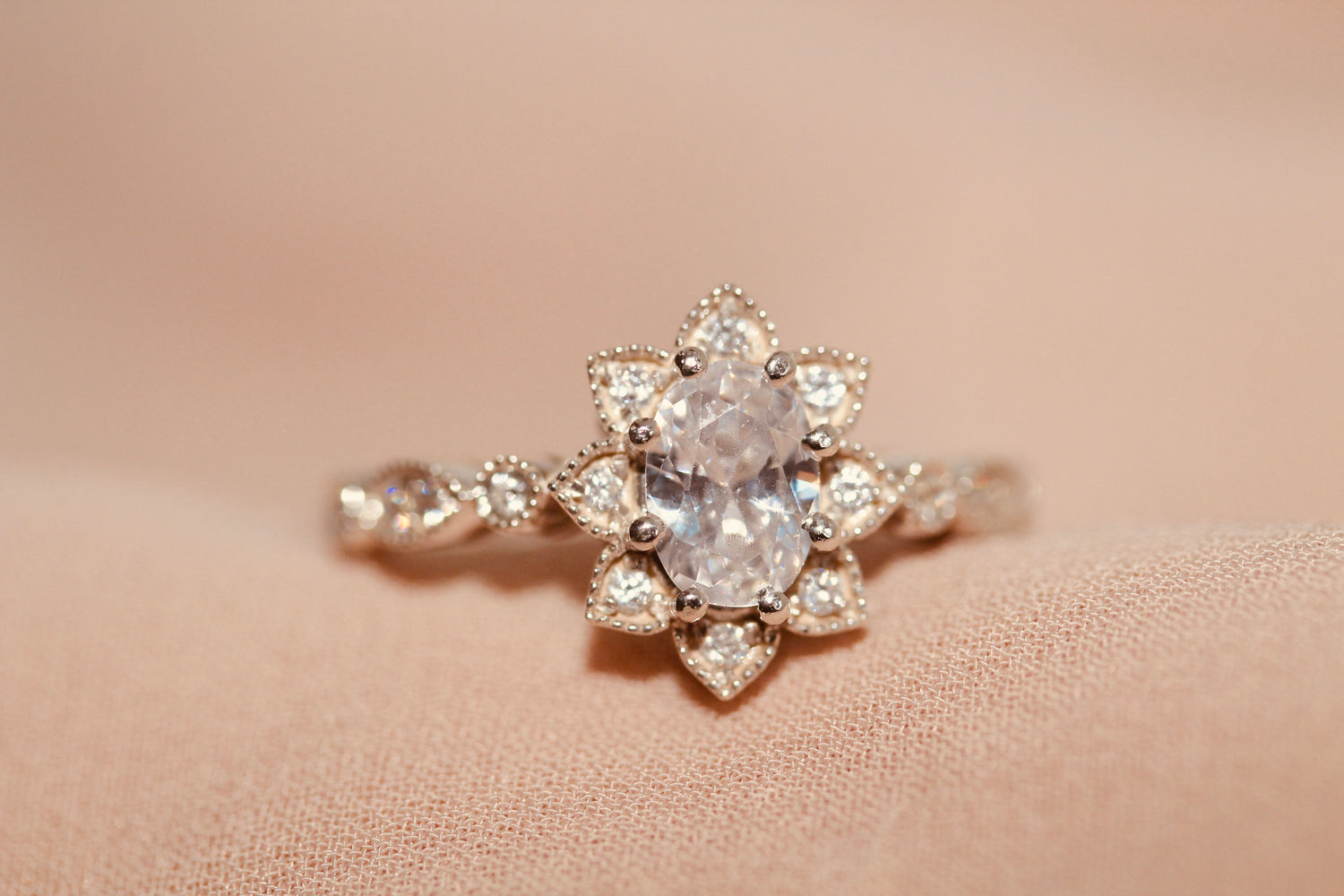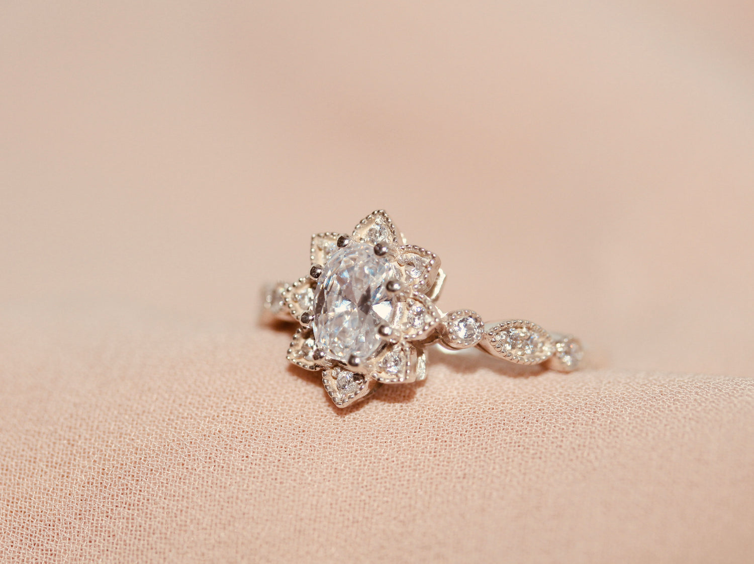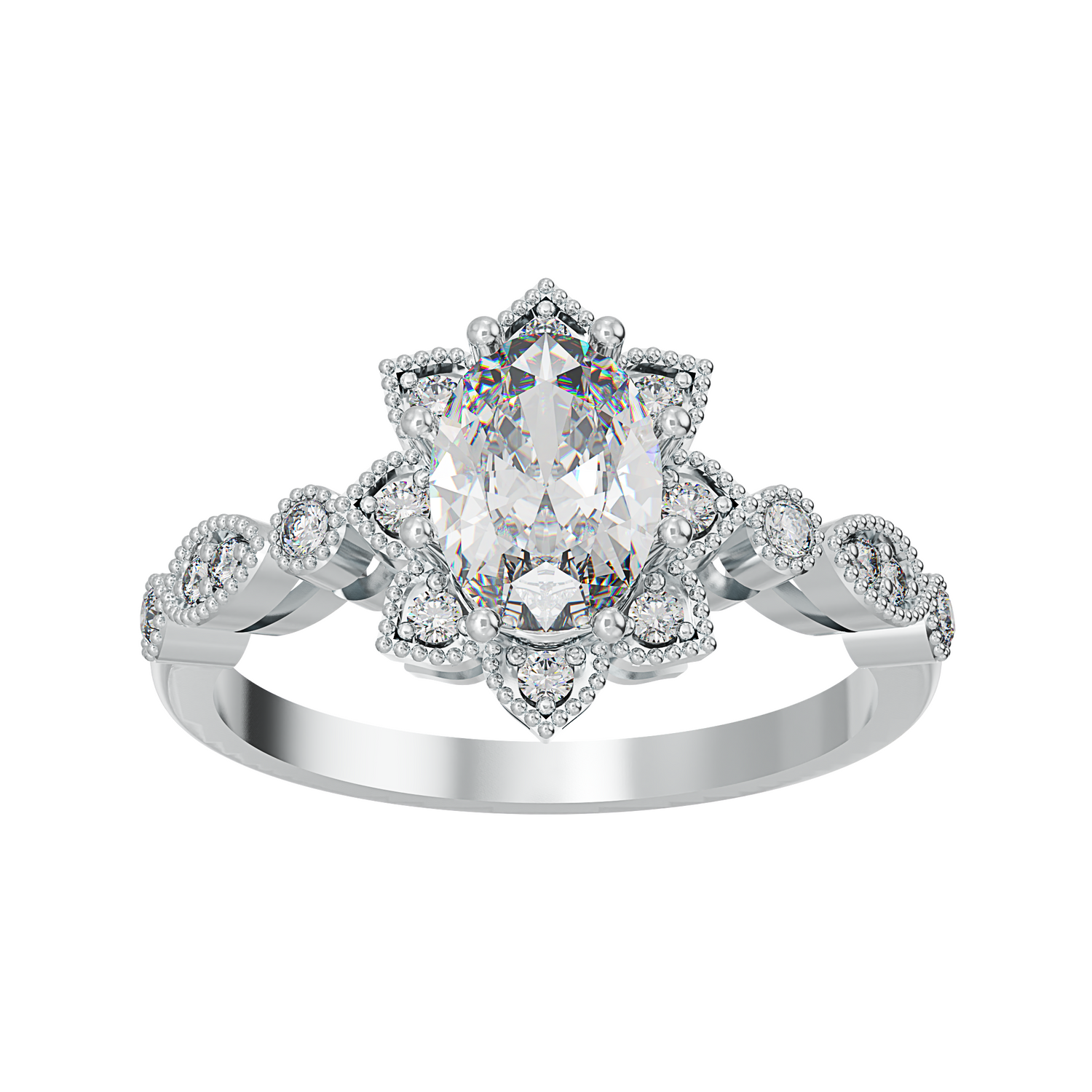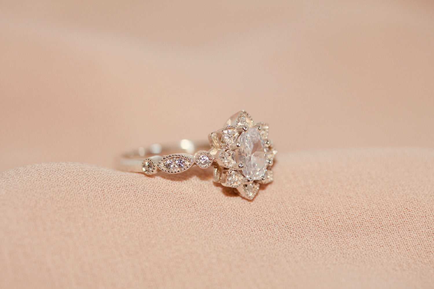 1 carat oval size shape centre stone and 16 x 1.25mm round shape white cubic zirconia stones