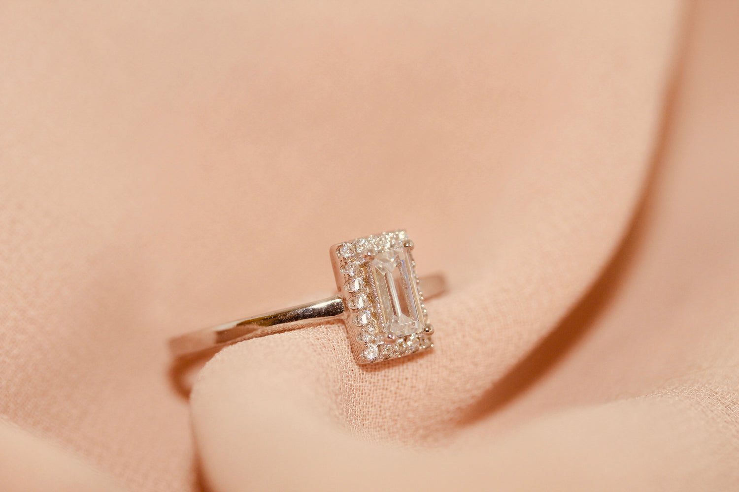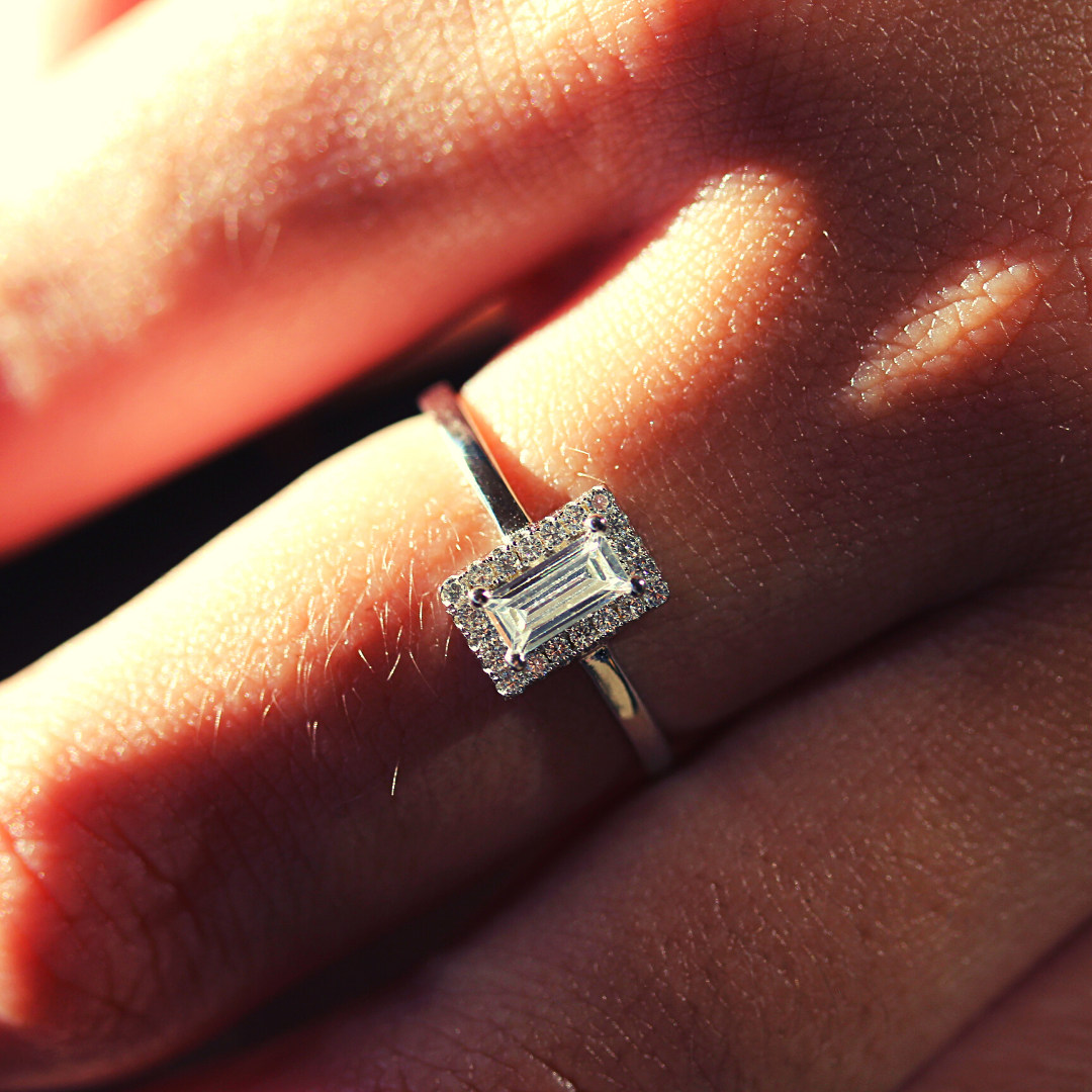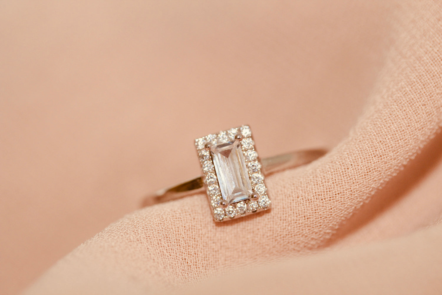 Charm, softness and elegance. The "Galina" commitment piece stands apart with its synthetic stone baguette cubic stone placement and sharp corners in a rectangular setting. The low setting and delicate band allow for ease of wear. This once-off design is for those who like neat, geometric designs that still retain a touch of softness and elegance.