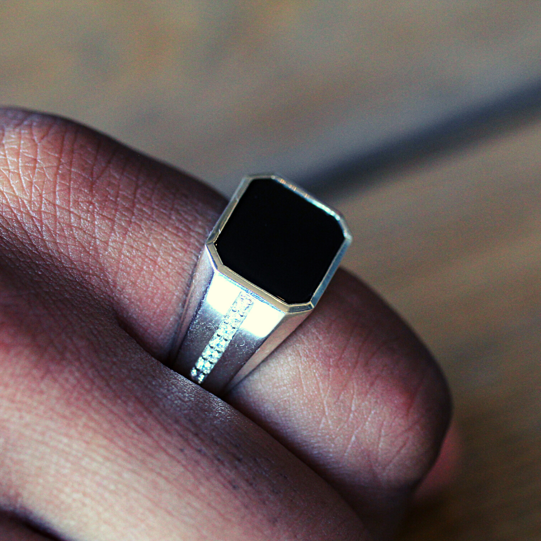 A unique sterling silver 925 gents ring, set with a genuine 15mm x 12mm elongated octagon horizontal shape ONYX stone and 16 x 1.25mm white round cubics zirconia stones down the side of the ring