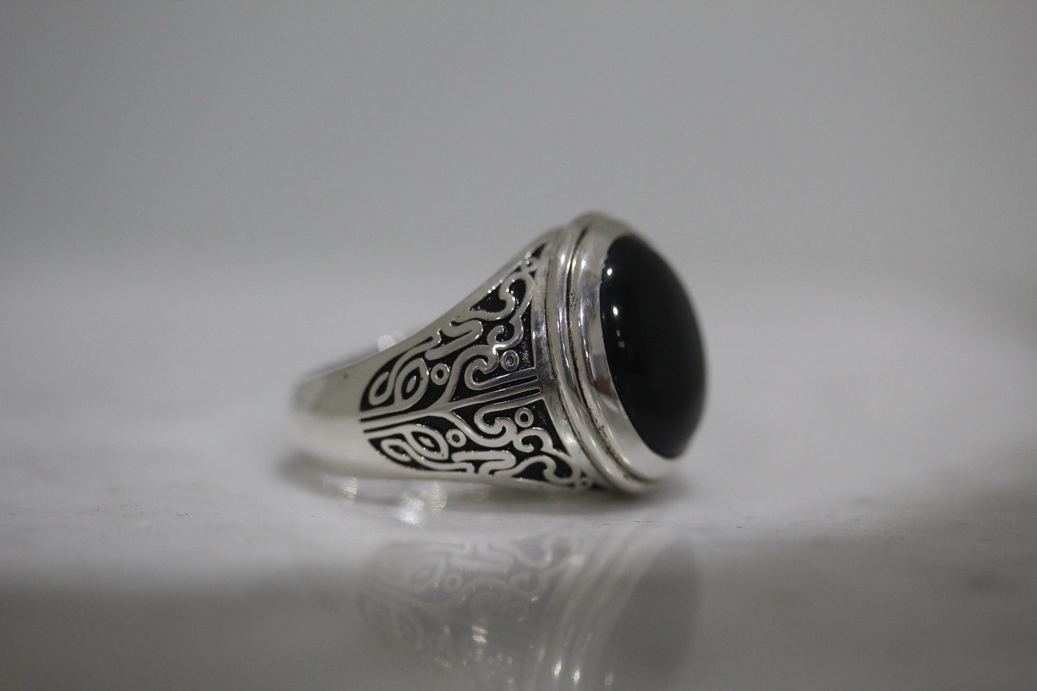 Sterling silver middle eastern inspired design, with a genuine black onyx and hand engraving on either side.