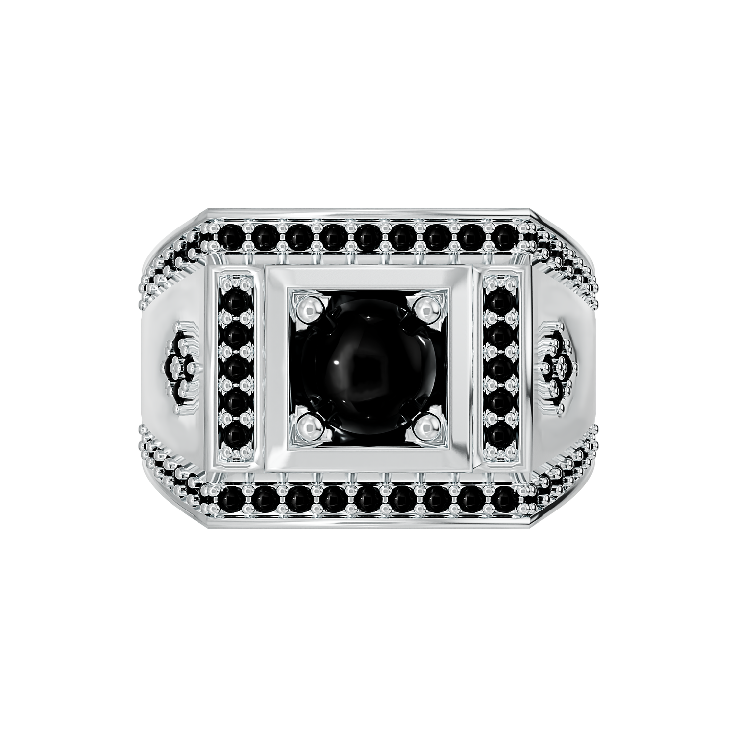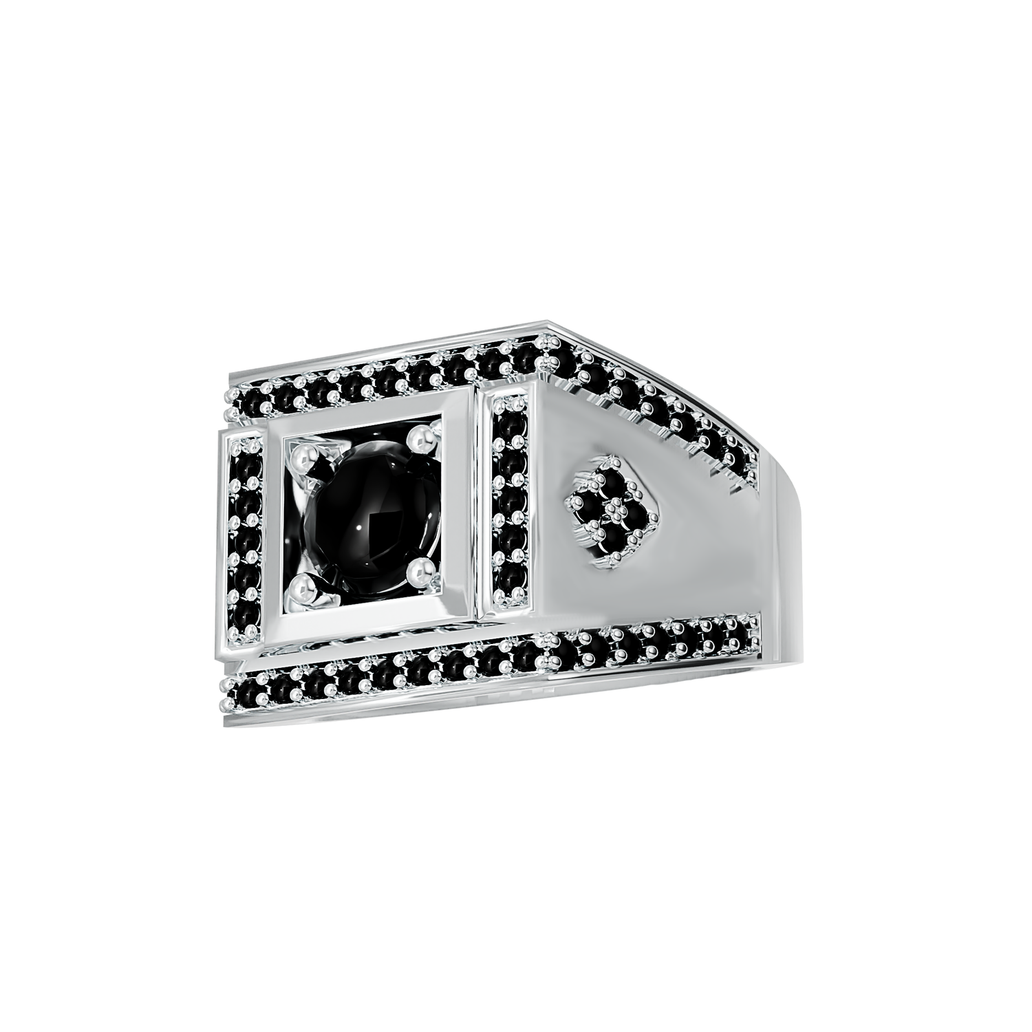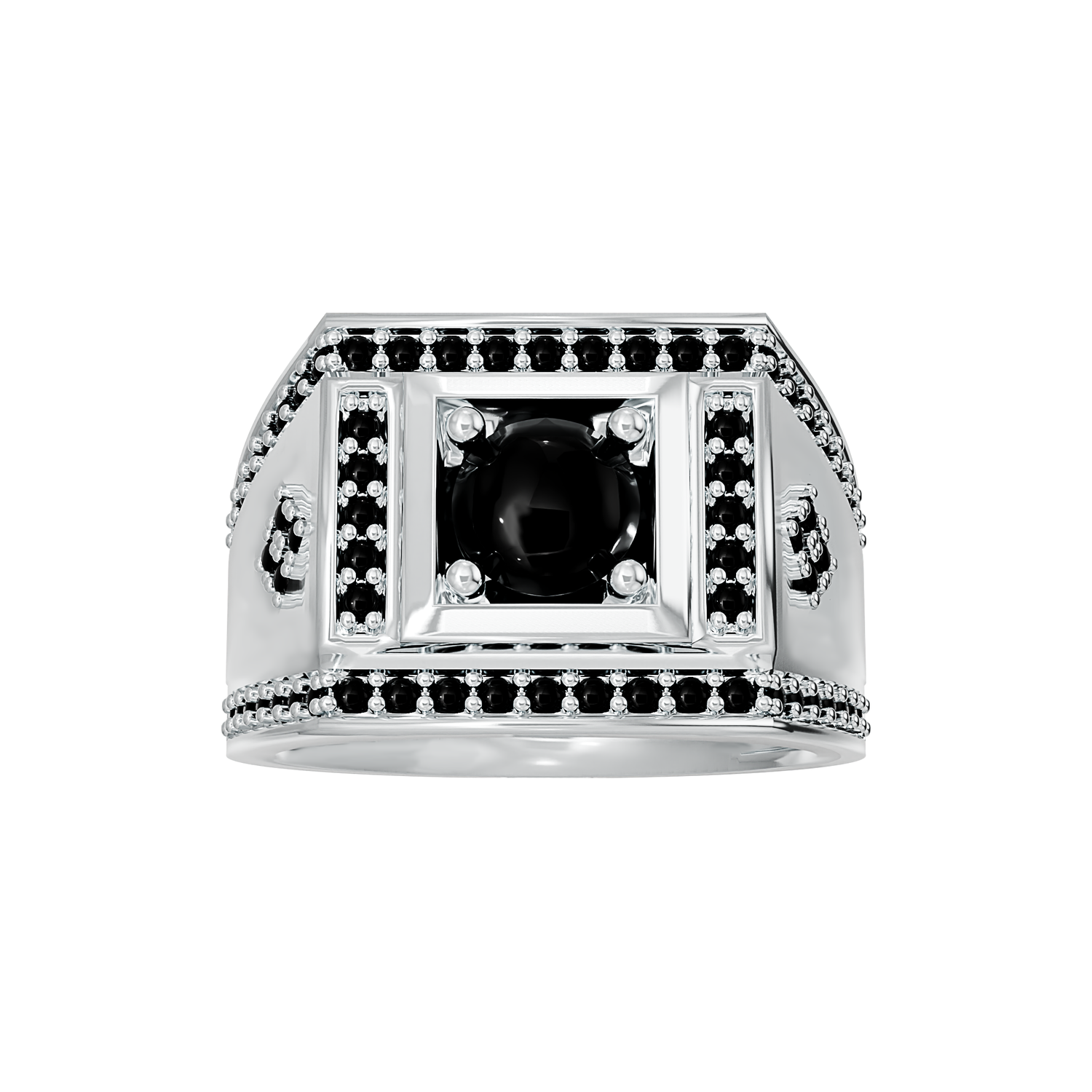 A unique sterling silver 925 gents ring, set with a 6mm round black cubic zirconia stone and 64 x 1.25mm round black cubic zirconia stones