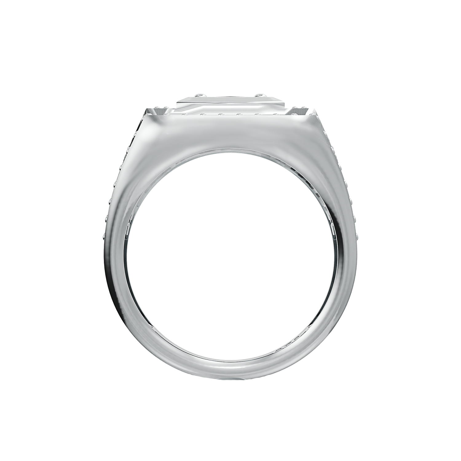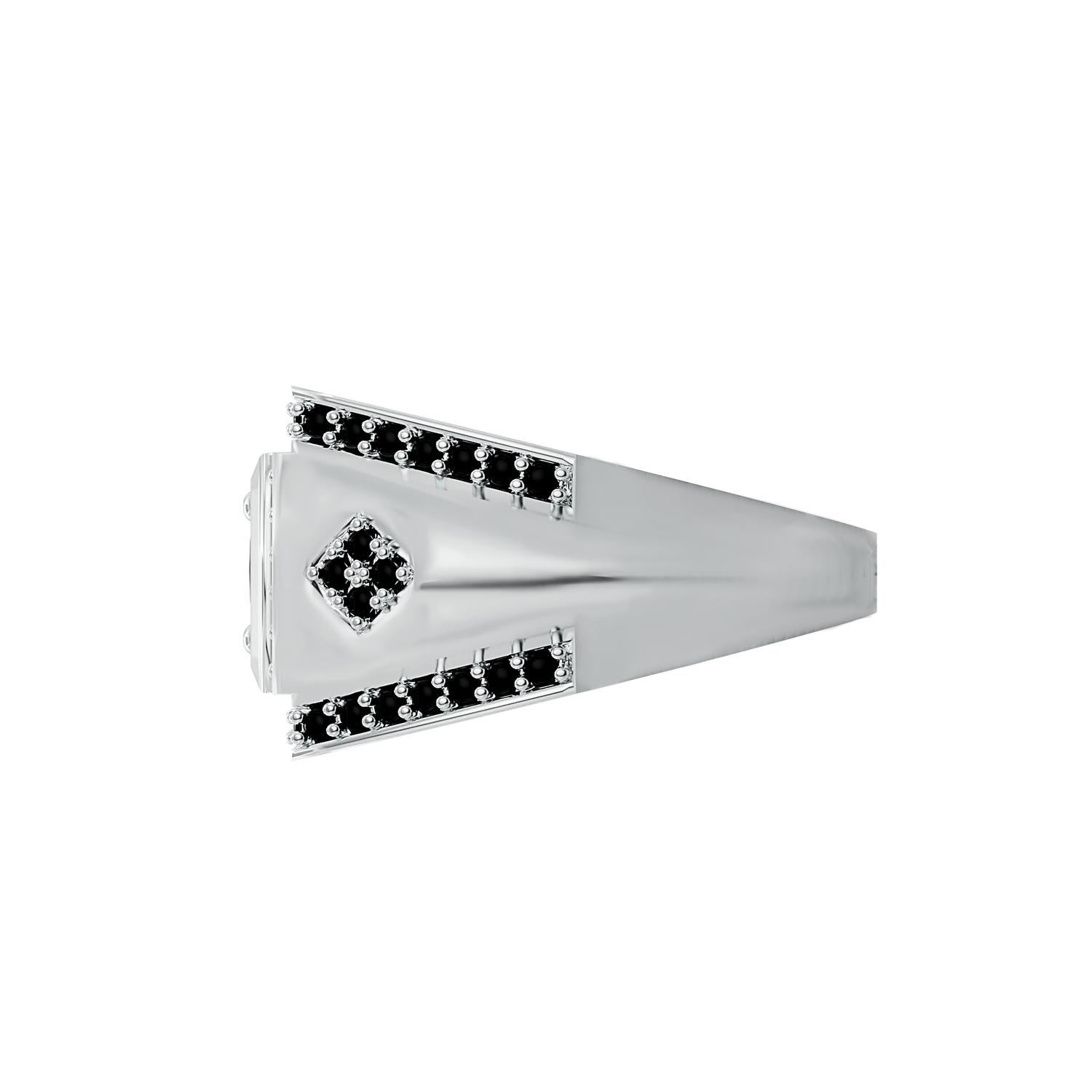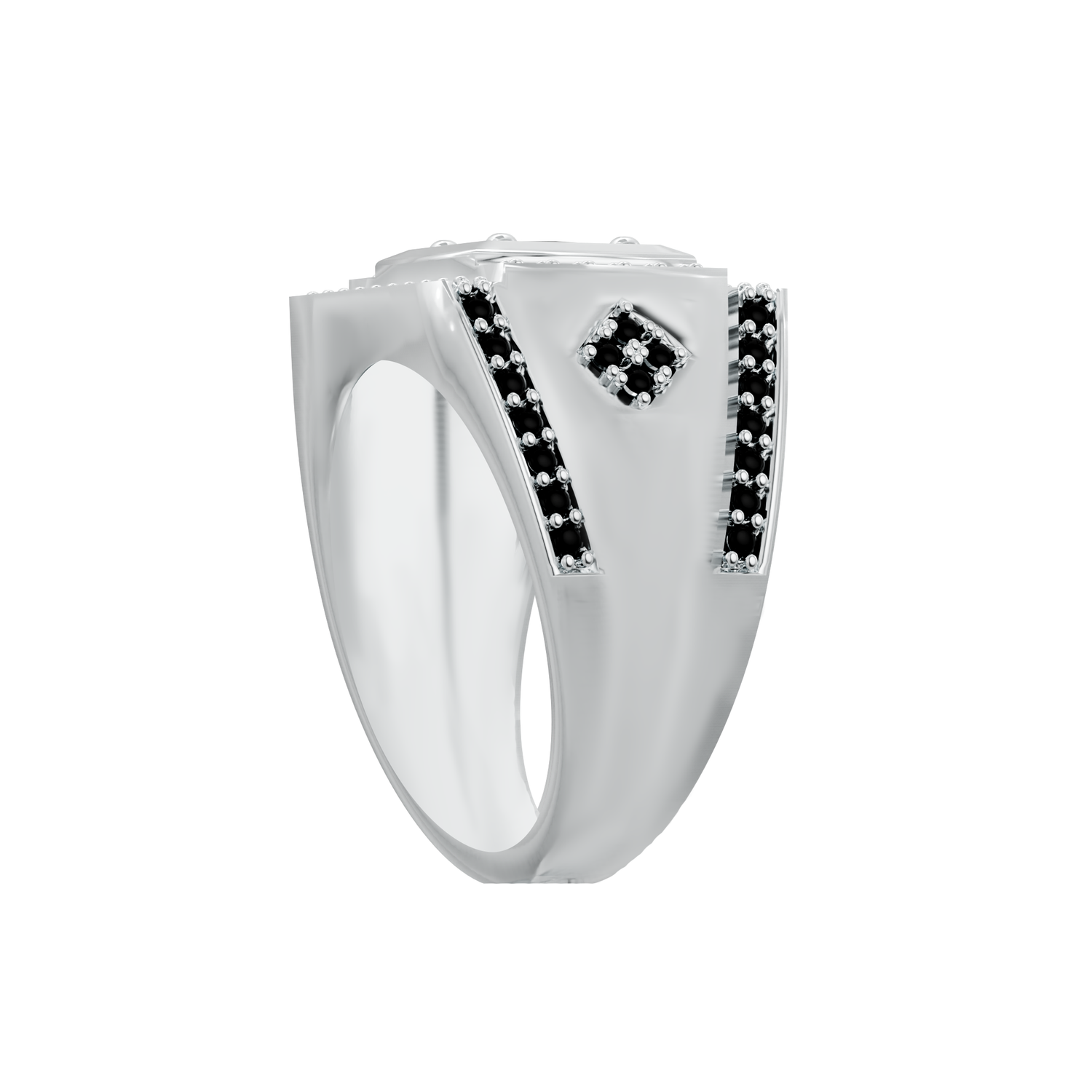 A unique sterling silver 925 gents ring, set with a 6mm round black cubic zirconia stone and 64 x 1.25mm round black cubic zirconia stones