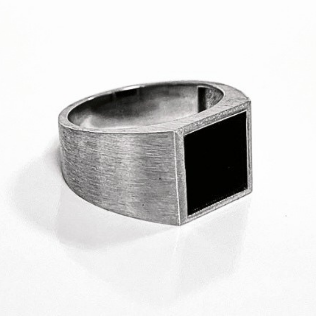 Sterling silver gents ring with a synthetic onyx stone in a matte finish.