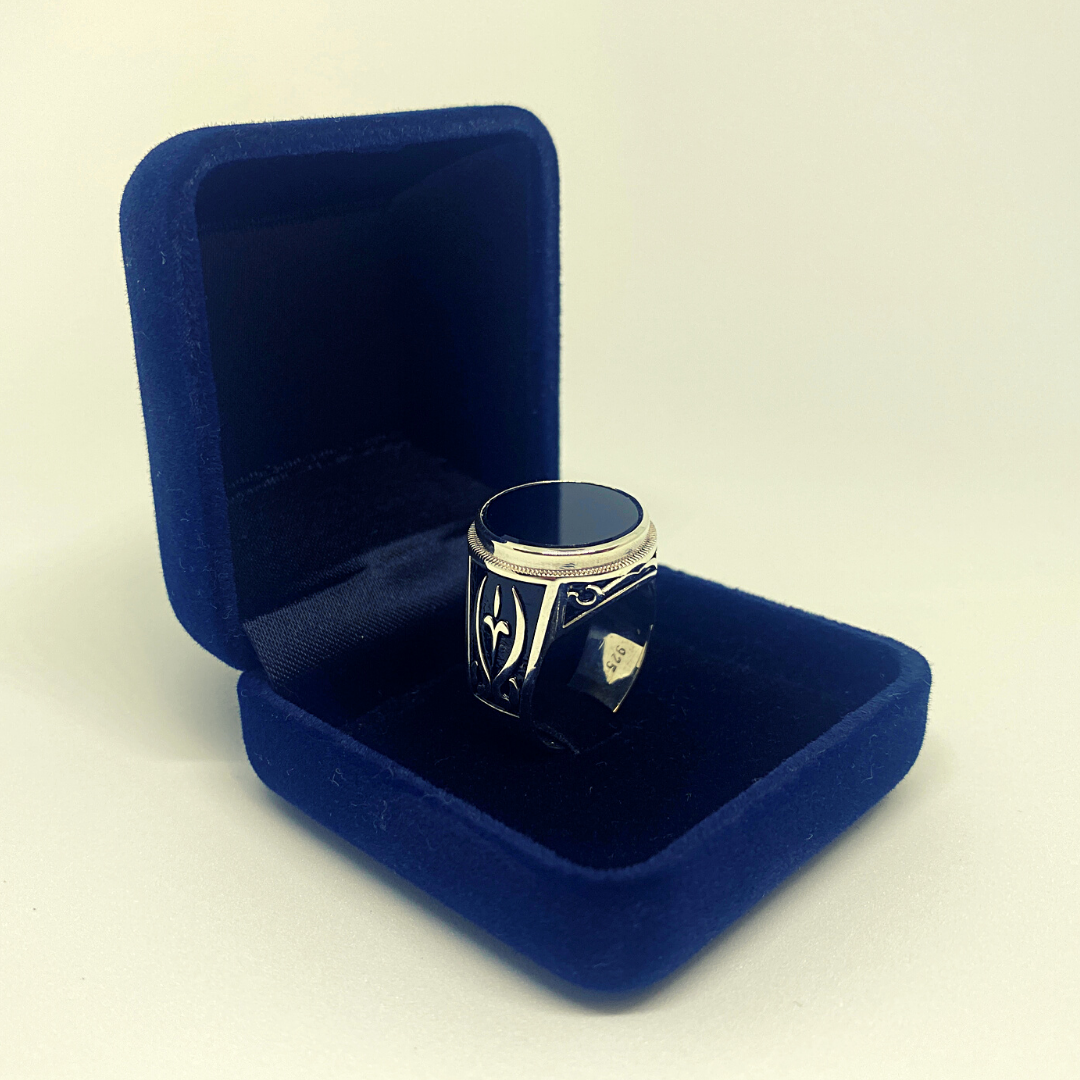 Classic gents design in sterling silver, with a genuine black onyx in a circular setting and hand engraving on either side.